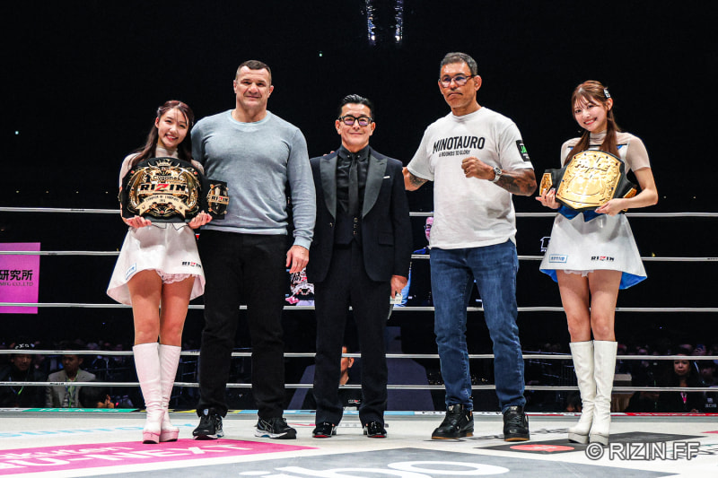 来日したミルコ(左から2番目)とノゲイラ(右から2番目)が、榊原代表と並ぶ
