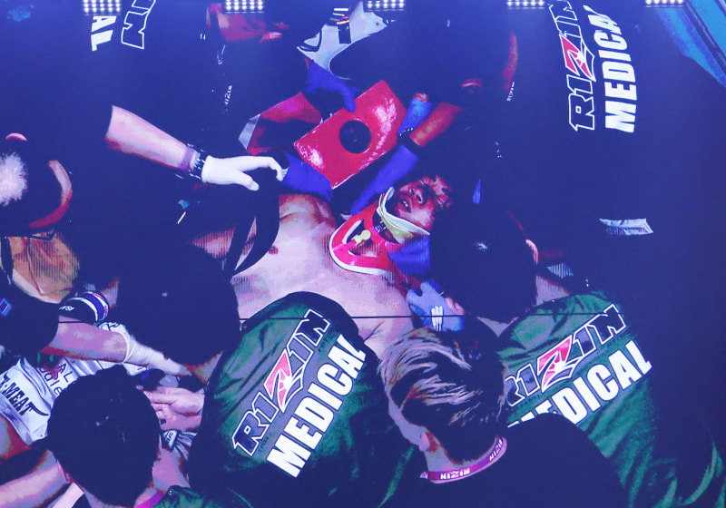 担架で運ばれる衝撃シーン(会場の大型ビジョンより)