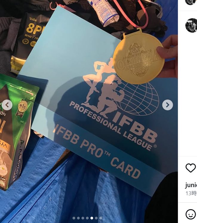 高須賀佑紀がボディコンテストで優勝したIFBBプロカードを持つ(@philip_kimura)