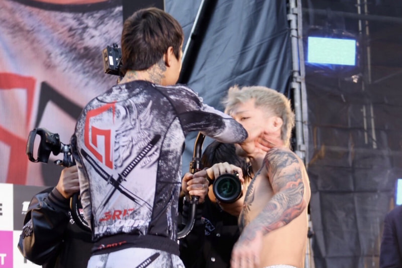 芦澤は右手で押し込むようなビンタ!ジョリーが後方へ吹っ飛ぶ