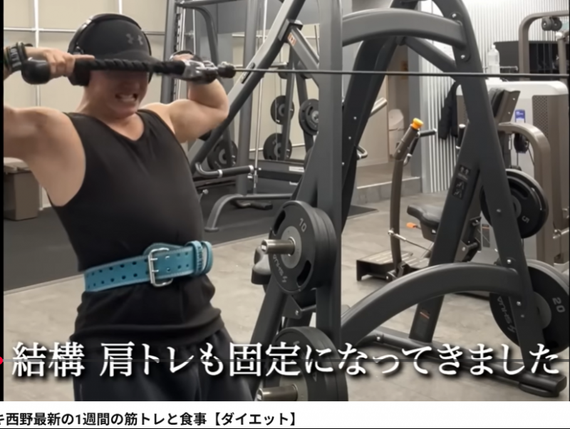 肩の後ろを鍛える西野(YouTubeチャンネル「コロチキ西野の100日ニキ」)