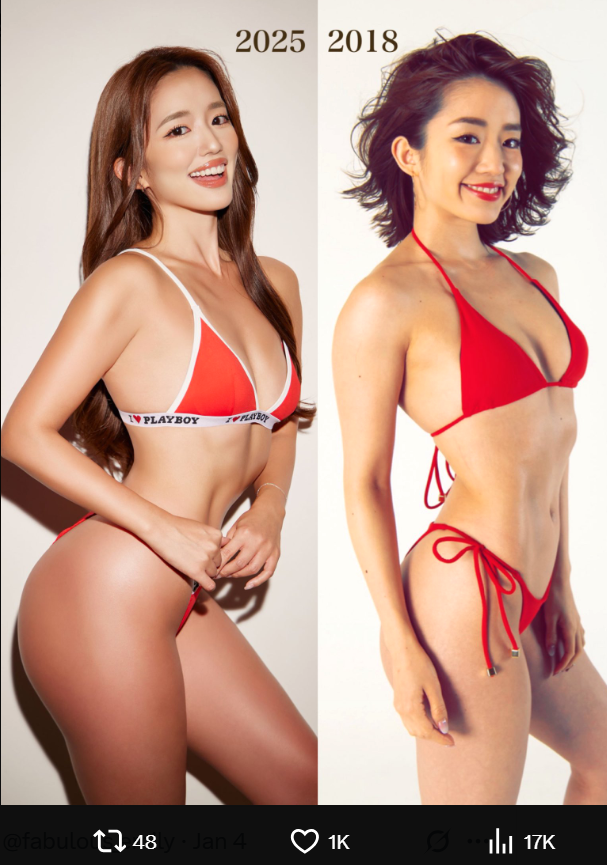 柳本絵美は、7年で巨大化したお尻の比較写真を投稿。右が2018年で左が現在の姿(@fabulous_emily)