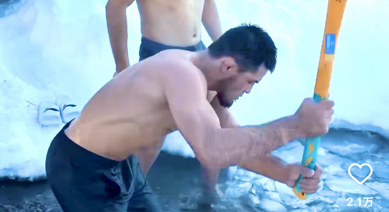 湖の氷を叩き割るシェイドゥラエフ @rajabali__shaidullaev
