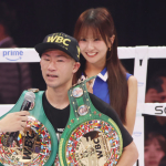 井上尚弥戦で笑顔の森脇(左)右は須藤セリナ