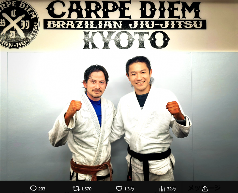 岡田准一(左)が出稽古した時の写真。右は佐藤元彦ヘッドインストラクター(@J_OKADA_AISTON)