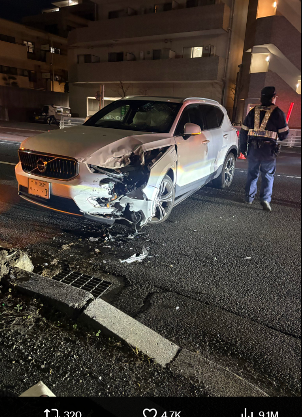愛車ボルボの事故後の様子。フロント部分が大破した(@hiromonster0401)
