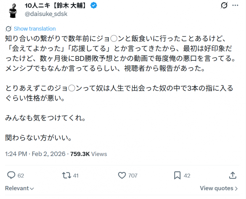 10人ニキは、Xでジョビンを批判(@daisuke_sdsk)
