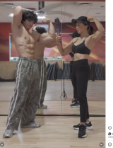 - 息子にポージング指導する西脇(@michikonishiwakiofficial)