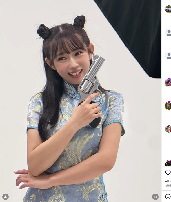 拳銃とポーズをとる堀江(@mina_horie)
