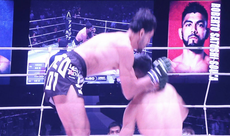 膝蹴りを食らったサトシは崩れ落ちる(会場の大型モニターより)