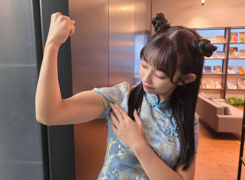 堀江聖夏がマッスルポーズ。腕の筋肉が発達している。