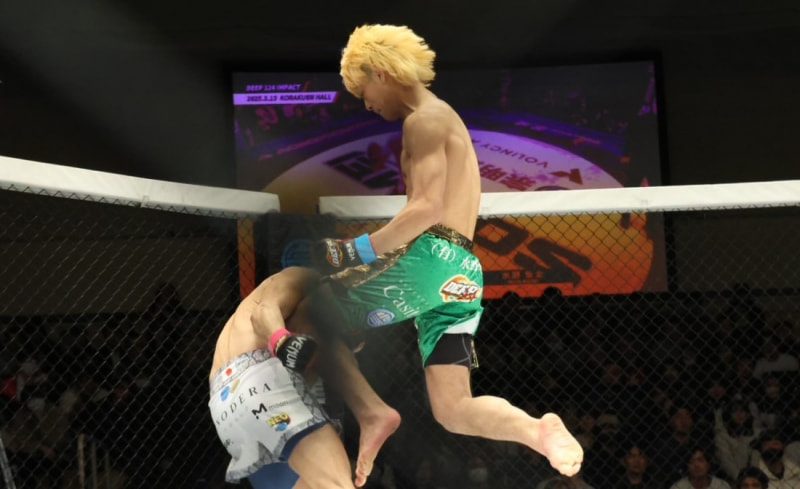 水野(右)がドンピシャの飛びヒザ蹴り