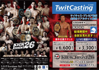 3月15日(日)東京・後楽園ホールにて開催の『KICK Insist26』が、ツイキャスにて全試合生配信される。