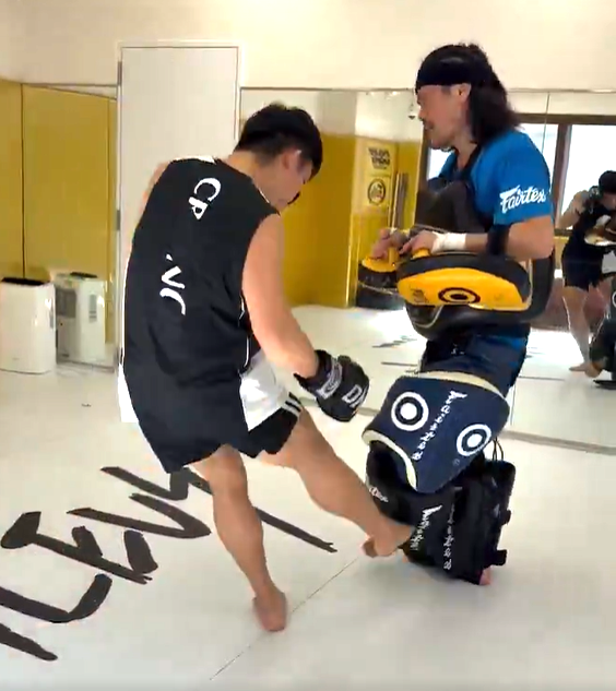 野杁のカーフキックをミットで受ける渡辺トレーナー@ONEChampionship