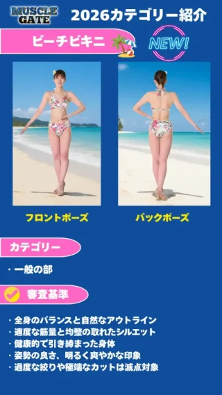 「ビーチビキニ」は初心者の登竜門と言われる「レギンス」部門から「ビキニフィットネス」や「ウーマンズフィジーク」部門を目指す際に中間となる段階。手持ちの水着で気軽に参加できるのも特徴だという。全身バランスよく適度に筋肉が発達し、健康的にシェイプされているかが審査基準になる。
