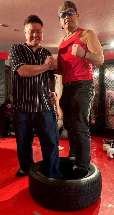 にっけん君(左)と、タイヤファイト連盟の入江会長