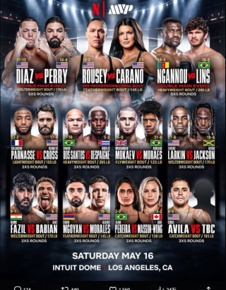5月16日(現地時間)、米ロサンゼルスで開催されるNetflix初のMMA大会『MVP MMA 1』全11試合のカードが発表された。ロンダ・ラウジーvsジーナ・カラーノの女子MMAの伝説対決をメインに、元UFC王者が2人も参戦。さらにMMA界屈指の人気者も復帰し「UFCホワイトハウス大会が食われる」の声もある。