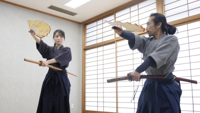 扇子の稽古風景。右が尾川宗家、左が安井南