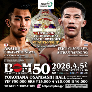 4月5日(日)神奈川・横浜大さん橋ホールで開催される『Shimizu presents BOM 50』(U-NEXT配信)のメインイベント、タイ国プロムエタイ協会フェザー級(-57.15kg)王者決定戦でペッチャオプラヤー・シットカムナンネン(タイ)と対戦する朝陽・エイワスポーツジム(エイワスポーツジム)のインタビューが主催者を通して発表された。
