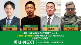 4月4日(土)にKNOCK OUT 常葉アリーナにて開催の『U-NEXT presents THE KNOCK OUT FIGHTER.7』が、U-NEXTで生中継される。