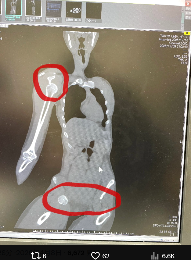 股関節と右肩脱臼のレントゲン写真(@keito_k1wsr)