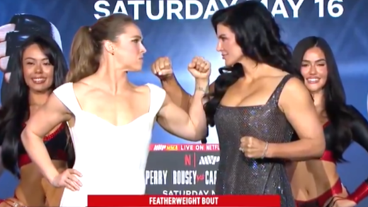 ラウジー(左)とカラーノ(右)がドレス姿で睨み合った(@MostVpromotions)