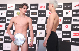 4月26日(日)に東京・後楽園ホールで開催される『RISE 197』の前日計量が、25日に都内で行われ、[第9代RISEライト級(-62.5kg)王座決定戦 3分5R延長1R]で対戦する奥山雅仁(OISHI GYM)はお盆で下半身を隠しながら登場し、62.40kgで計量パス。塩川琉斗(TOP STAR GYM)も62.50kgで計量パスした。