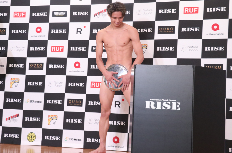 奥山はお盆で下半身を隠しながら計量に登場
