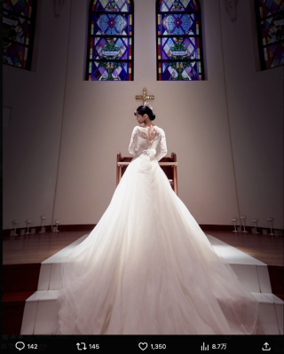 今回の結婚の報告ではウエディングドレスの画像とともにメッセージも掲載。