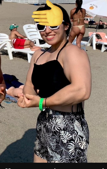 砂浜で水着姿の竹中はマッスルポーズ(@ayane_takenaka)