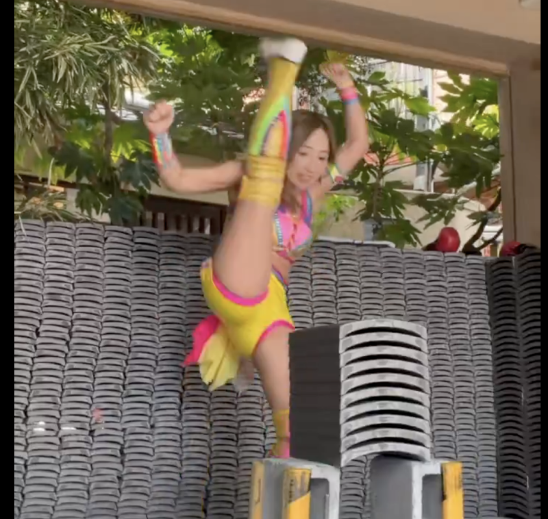 愛川ゆず季がかかと落としで瓦10枚割りに成功!(@yuzuponponpons より)