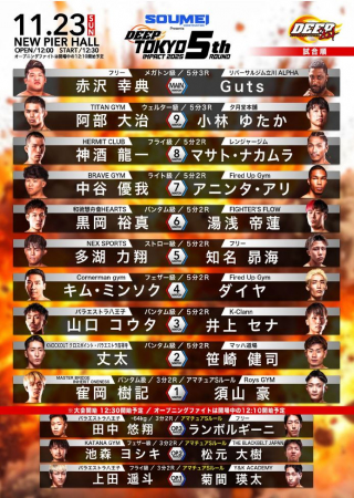 メインイベント(第10試合)は、DEEPメガトン級 5分3Rとして、1年半ぶりの参戦となる赤沢幸典(フリー)と、3戦3勝すべて1ラウンドKO中のGuts(リバーサルジム立川ALPHA)が対戦。セミファイナル(第9試合)はDEEPウェルター級 5分3Rで、阿部大治(TITAN GYM)と小林ゆたか(夕月堂本舗)が激突。第8試合のDEEPフライ級 5分3Rでは、神酒龍一(HERMIT CLUB)とマサト・ナカムラ(レンジャージム)が対戦する。