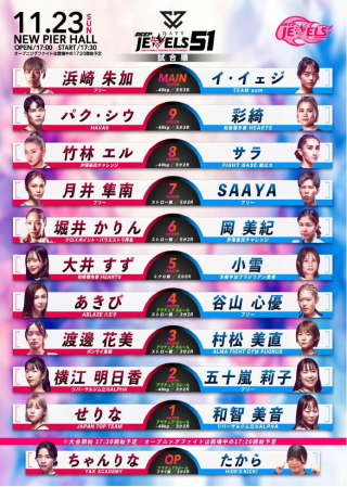 メインイベント(第10試合)は、DEEP JEWELS 49kg以下 5分3Rとして、浜崎朱加(フリー) とイ・イェジ(韓国/TEAM aom)が対戦。セミファイナル(第9試合)はDEEP JEWELS 49kg以下 5分3Rで、パク・シウ(韓国/HAVAS)と彩綺(和術慧舟會HEARTS)が激突。第8試合は、DEEP JEWELS 49kg以下 5分2Rで竹林エル(伊澤星花チャレンジ) とサラ(fightbase都立大)が対決する。
