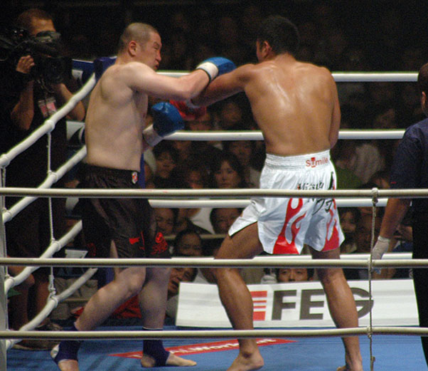 パンチの連打が効果的、極真の佐藤(左)が勝利した