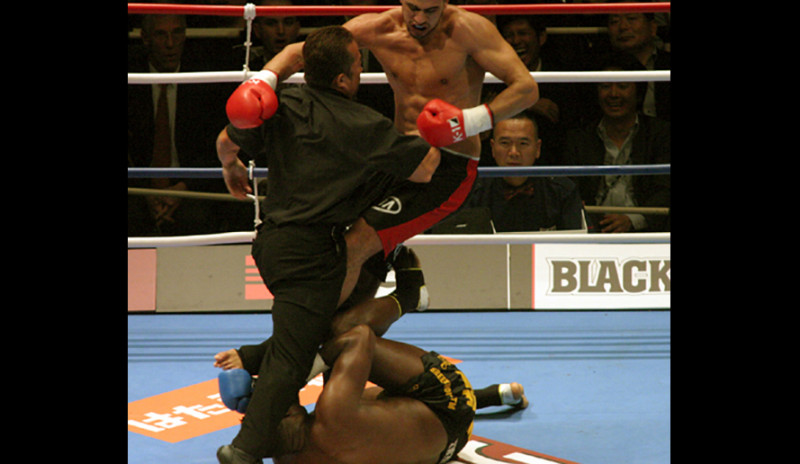 転倒させたボンヤスキーにハリが殴りかかり、顔面を踏みつけるという暴挙に!