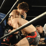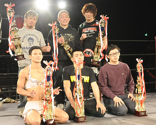 今年の新人王トーナメント優勝者(前列左よりバタフライ、下石、井上、後列左よりランボー、堀口、佐々木)