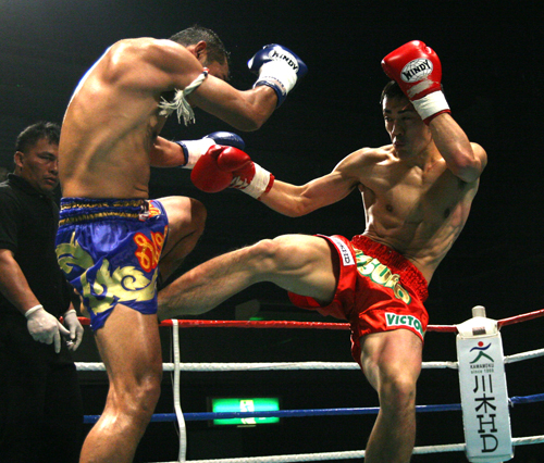 TATSURO(右)が右ローを蹴り続けてダメージを与え、判定勝ち