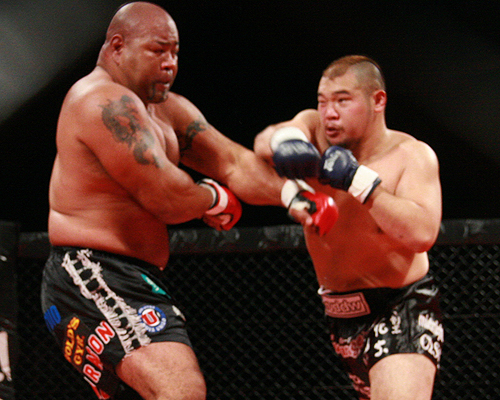 井上(右)がパンチとヒザ蹴りでKO勝利