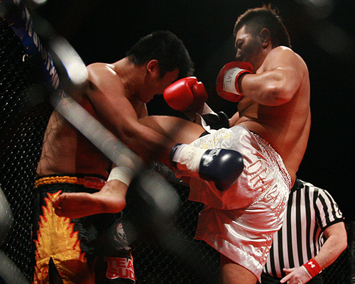 高萩(右)がパンチとヒザ蹴りを使って小澤をKO