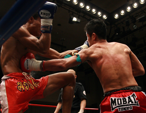 強烈な左ボディでKO勝利したラジャダムナンスタジアム認定スーパーライト級王者・石井宏樹(右)