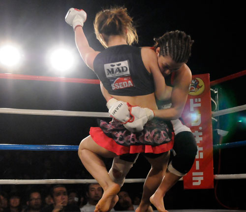 バ折りのような形でテイクダウンにいった浜崎(右)。この時、ソヒは腰を強打して痛みが再発したと思われる