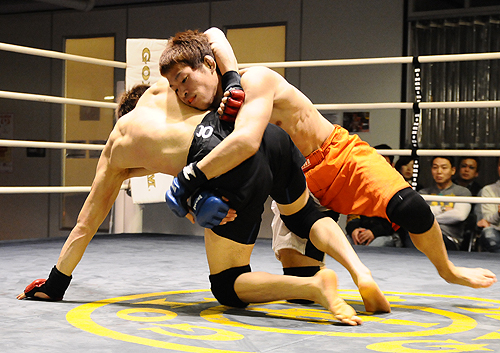 何度かテイクダウンを奪った金井塚(右)だったが極めきれずドロー