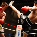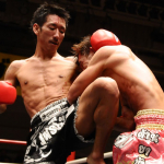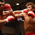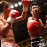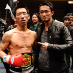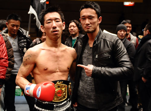 NKBフェザー級王者に輝いた夜魔神(やましん・左)を祝福する梅野源治