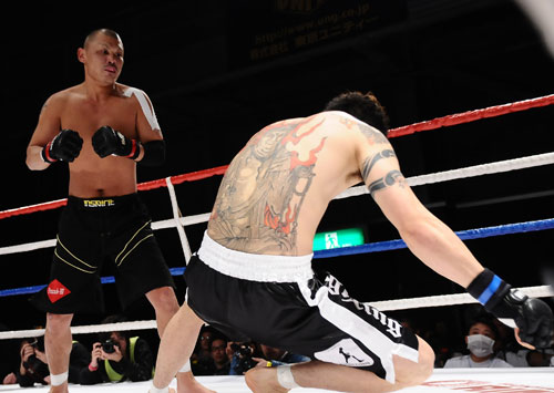 山口(左)はパンチ一撃で久保をマットに沈めた