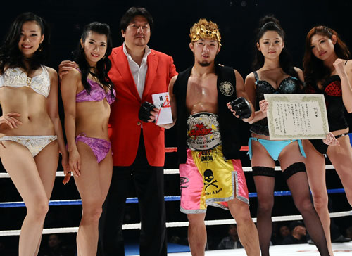 第2代THE OUTSIDER 70-75kg級王者に輝いたソルジャーボーイ一樹(右から3番目)を祝福する前田日明代表(左から3番目)とラウンドエンジェル