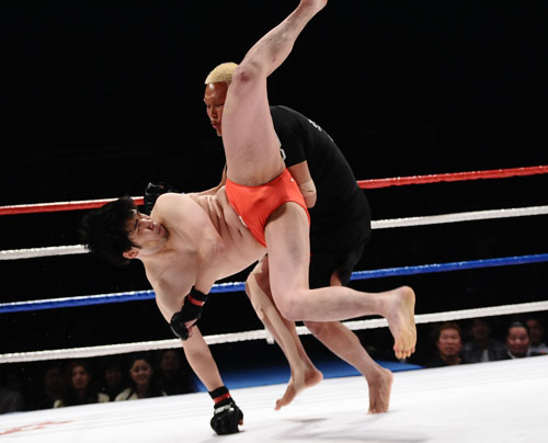 前田日明ばりのフライングニールキックを見舞ったシバ仁田厚