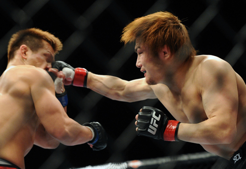 光岡のパンチをもらう場面もあった五味(右)だが2Rに逆転勝利
