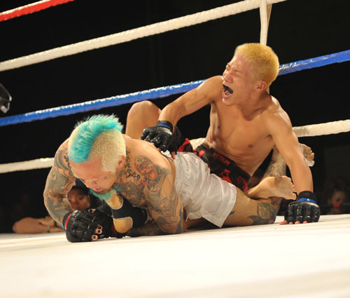 寝技を得意とする土橋(左)が膝十字固めを極めて一本勝ち