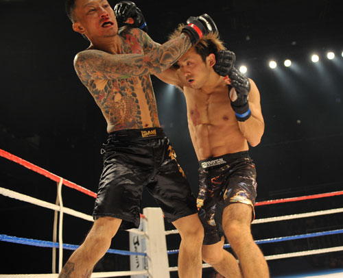 初出場の将太(右)がユウタ(左)にTKO勝ち