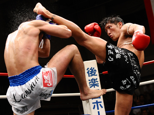 左ハイを放つ渡部太基(右)。雪丸にTKO勝ちし、3連勝となった